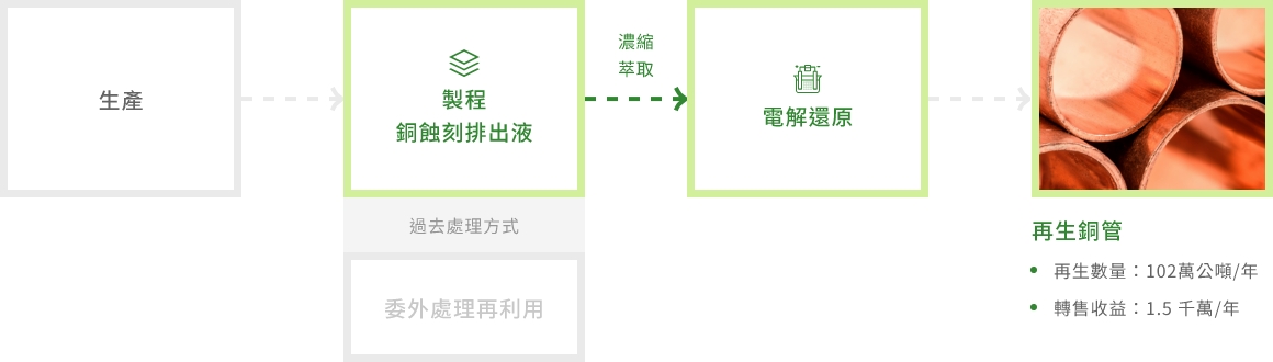 - 將蝕刻下來含銅之廢液,透過電解方式,製作高純度之銅管,轉為其他工業領域應用
