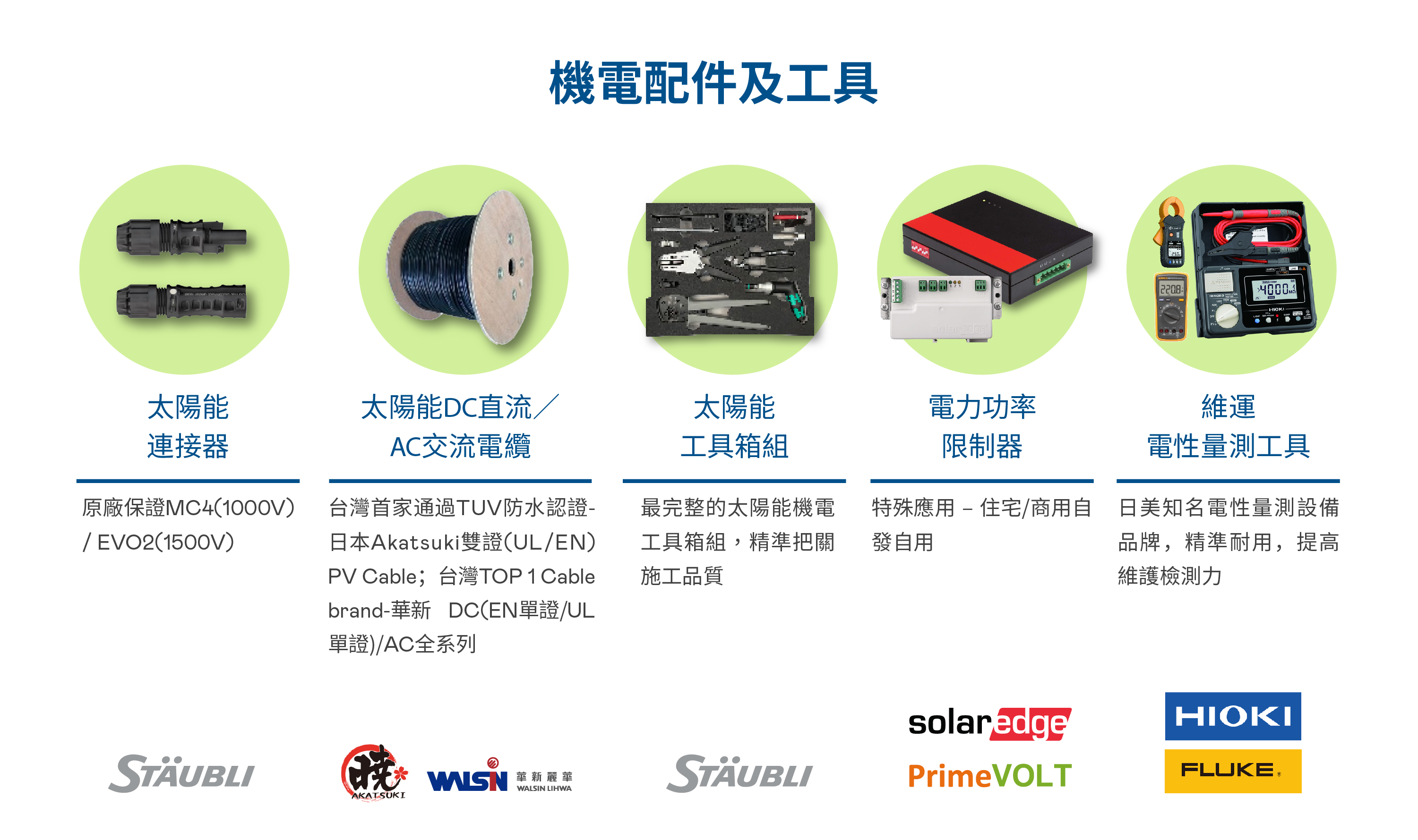 在「一站式購足」服務範疇下,XPJ·(中国区)官方除自有太陽能模組及監控監控軟硬體整合方案外, 同時提供客戶太陽能電廠其它的可靠優質零組件品牌與產品,包含電廠的重要組件如變流器、連接器、電線電纜、環境偵測裝置及相關輔佐材料與工具。